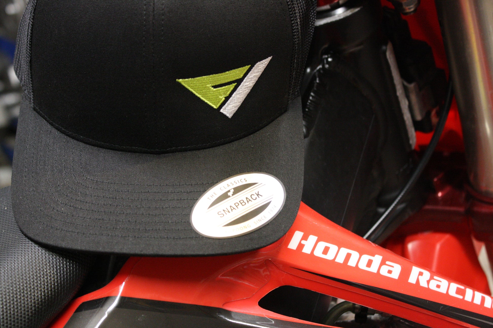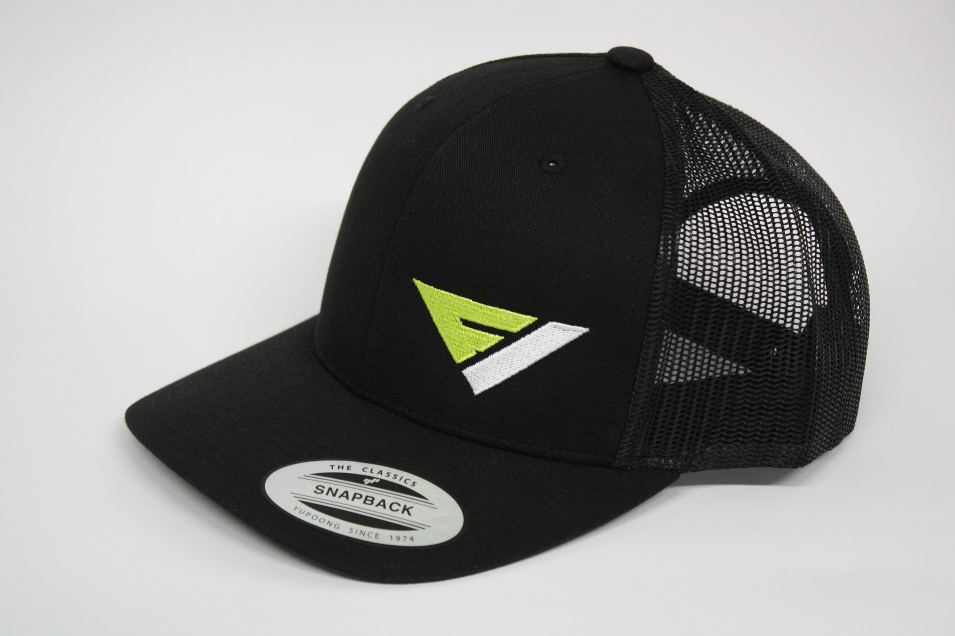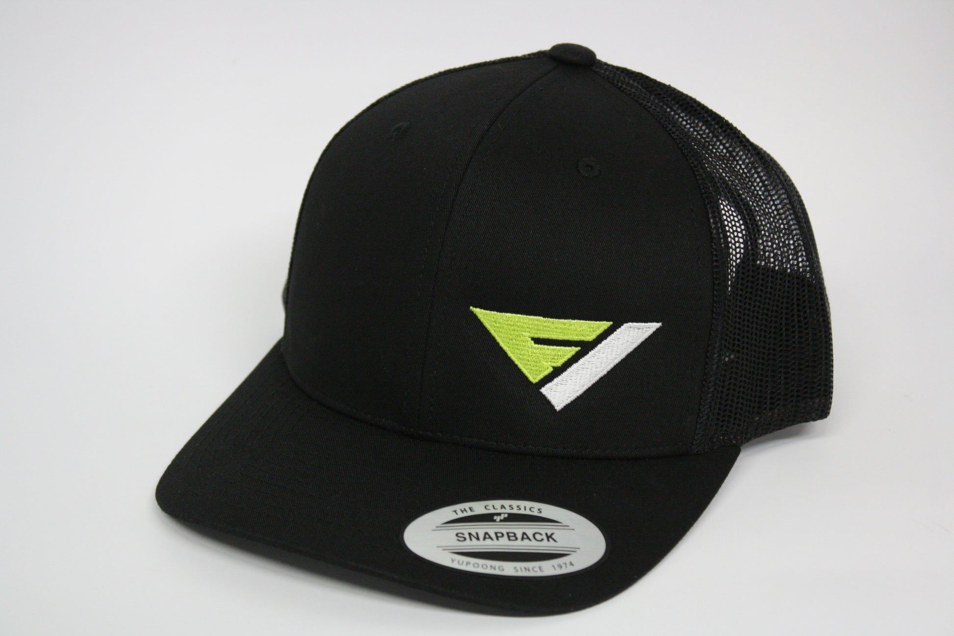 Our Flow Vision Logo Snapback a Retro Trucker Hat made of a blend of 47/25/28 cotton/polyester/nylon front and 100% polyester mesh back. It is adjustable with a plastic tab closure pre-curved bill....