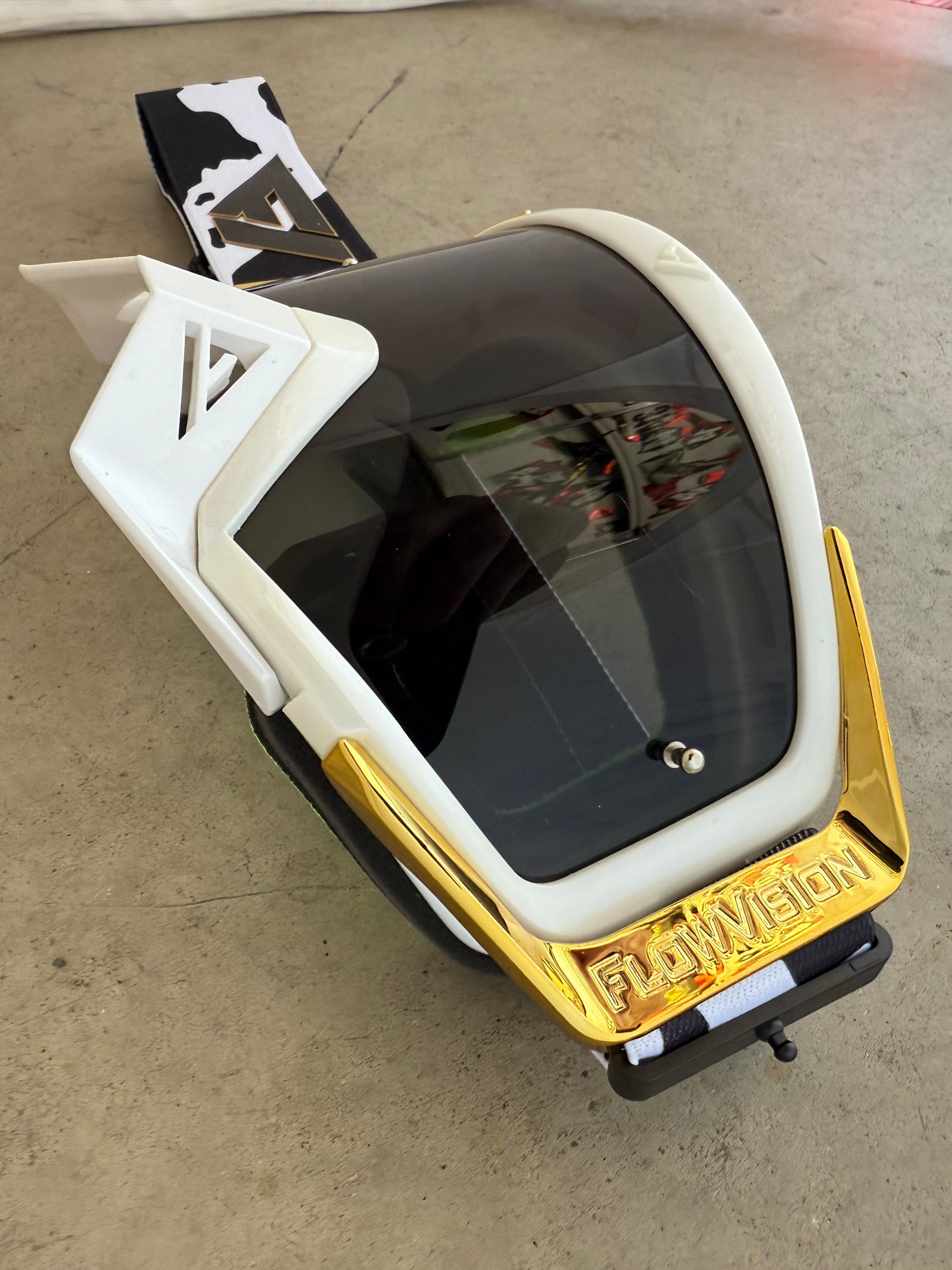 - Pearl White Painted Frame and Metallic Gold Outriggers with a Smoked Lens